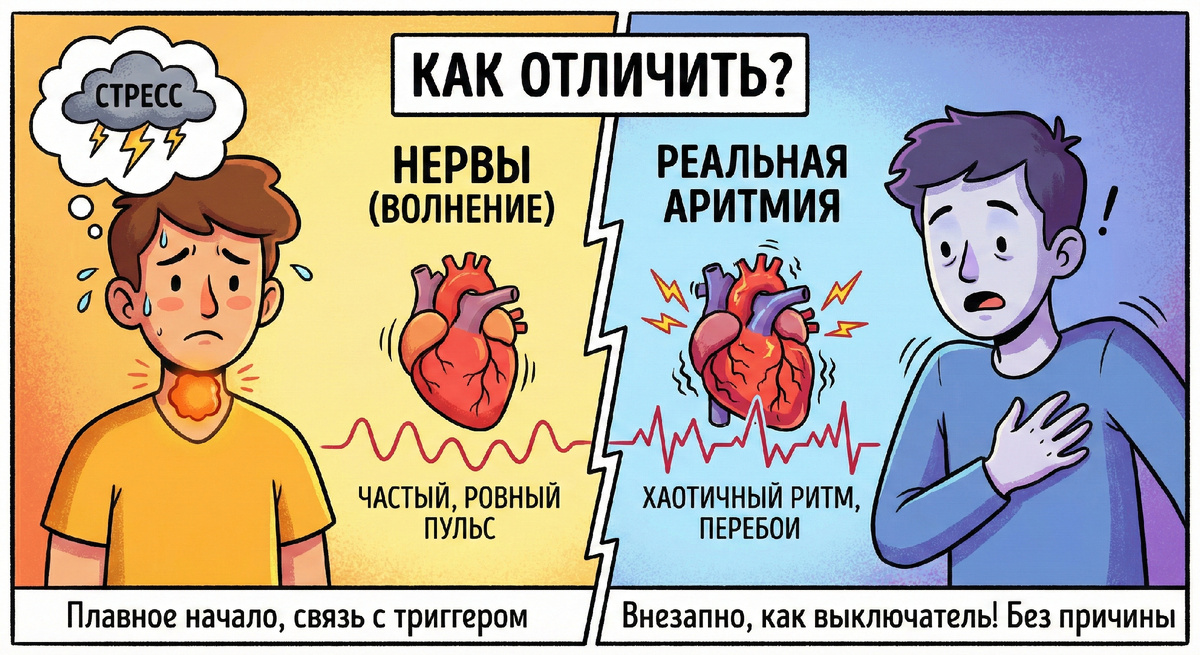 И вы думаете "это просто нервы, переволновалась, пройдёт". Сердце колотится неровно, в горле комок, руки трясутся. Вы ждёте когда успокоитесь. А на самом деле пропускаете признаки аритмии, которая требует внимания кардиолога прямо сейчас. Вот в чём разница: при обычной стрессовой тахикардии сердце бьётся быстро, но ритмично. Как барабан — тук-тук-тук-тук, часто, но равномерно. Вы понервничали, пульс ускорился до 100-120, но удары идут через одинаковые промежутки. Подышали, успокоились — всё вернулось в норму через 10-15 минут. А при аритмии пульс неровный. Тук-тук—тук—тук-тук-тук—тук. Удары идут с разными интервалами, сердце будто спотыкается, пропускает удары или наоборот делает лишние. И это не проходит когда вы успокаиваетесь. Или проходит, но возвращается снова и снова при малейшем волнении или вообще в покое. Ком в горле — это не просто ощущение сдавленности от тревоги. При аритмии это может быть реальный симптом нарушения ритма, особенно если одновременно чувствуете перебои в се