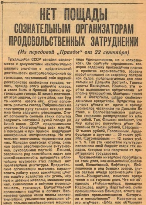 Бывший дворянин и царский генерал проф. А.В.Рязанцев назвал целью своей организации "задушить советскую власть мясным голодом" и свергнуть советскую власть с "мясного конца".