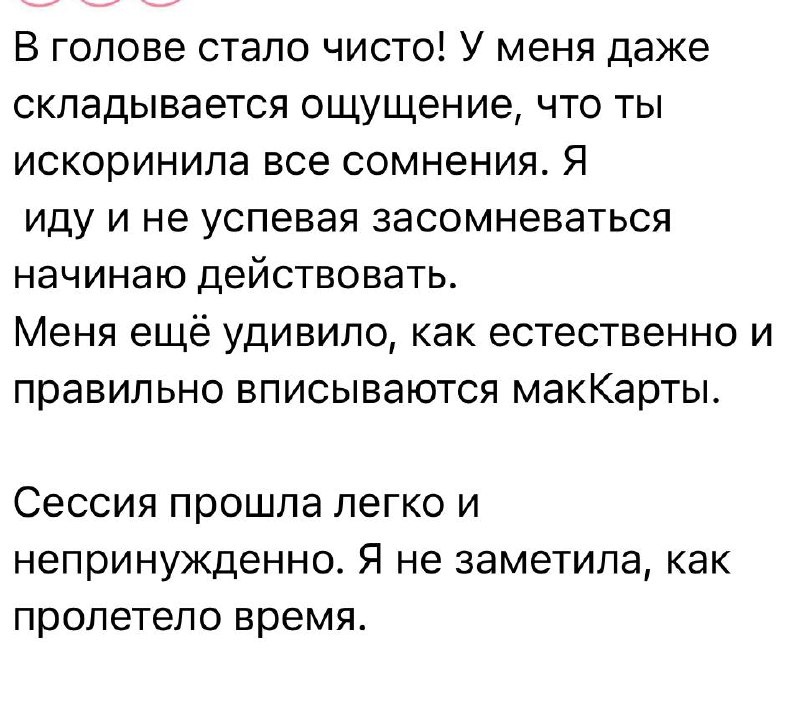 ——————-———-———— Редко делюсь с вами отзывами своей работы. В работу можно идти с совершенно любым запросом. Разберем, что важно в данной ситуации вашему телу, вашим чувствам и мыслям.