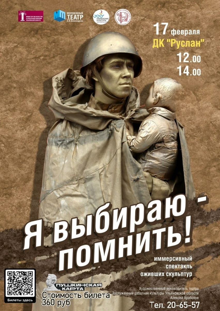 17 февраля в 12:00 и 14:00 состоится показ спектакля «Я выбираю – помнить!» (12+). В нем персонажи словно ожившие скульптуры олицетворяют собой образ участников Великой Отечественной войны под знакомые военные песни. Фото: Дворец культуры «Руслан» Оперативные новости в МАХ