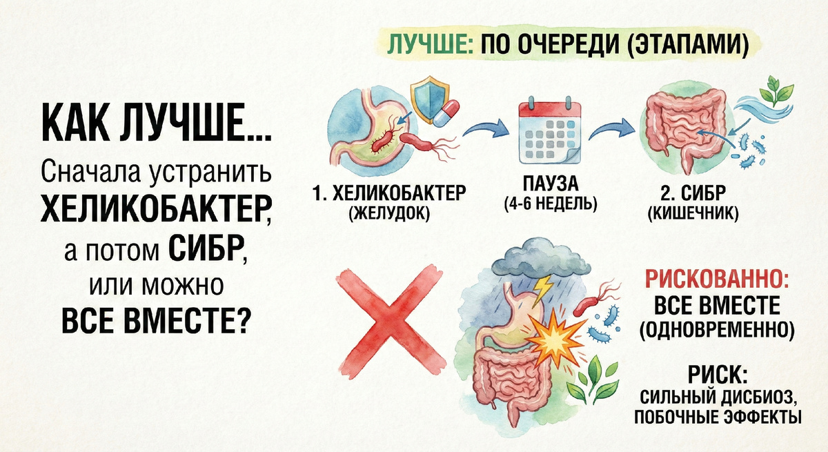 Сначала устранить хеликобактер, а потом СИБР, или можно все вместе одновременно?