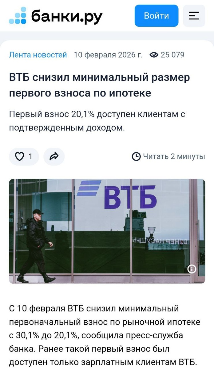 С 10 февраля ВТБ снизил минимальный первоначальный взнос по рыночной ипотеке с 30,1% до 20,1% для всех заемщиков с подтвержденным доходом. ❗️Для клиентов без подтвержденного дохода необходим ПВ от 40,1% #ипотека2026