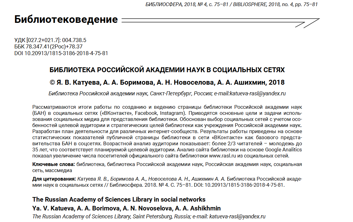 Катуева Я. В., Боримова А. А., Новоселова А. Н., Ашихмин А. А. Библиотека Российской академии наук в социальных сетях