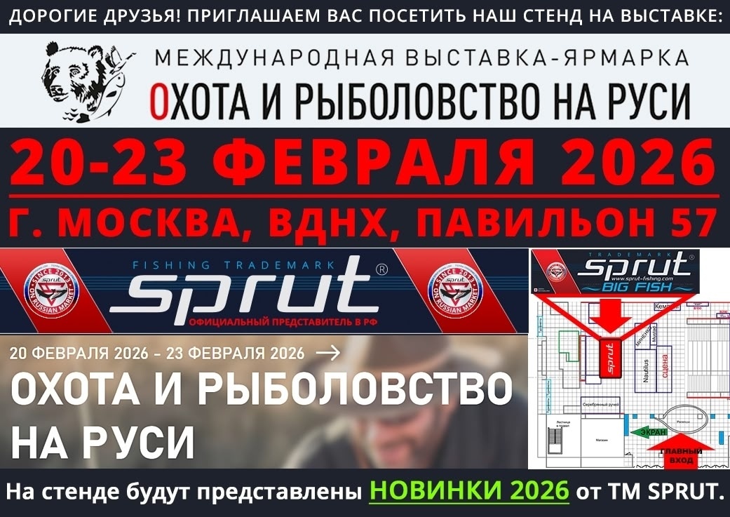 Друзья, команда компании SPRUT, приглашает Вас на выставку "ОХОТА И РЫБОЛОВСТВО НА РУСИ", которая пройдёт 20-23 февраля в г.Москва, ВДНХ, Павильон 57. На стенде будут представлены новинки 2026 года, а так же эксклюзивный воблер, посвящённый 10-и летнему юбилею ДРК "ЩУКА"😊👍 Приходите, Вам обязательно понравится 👍😉