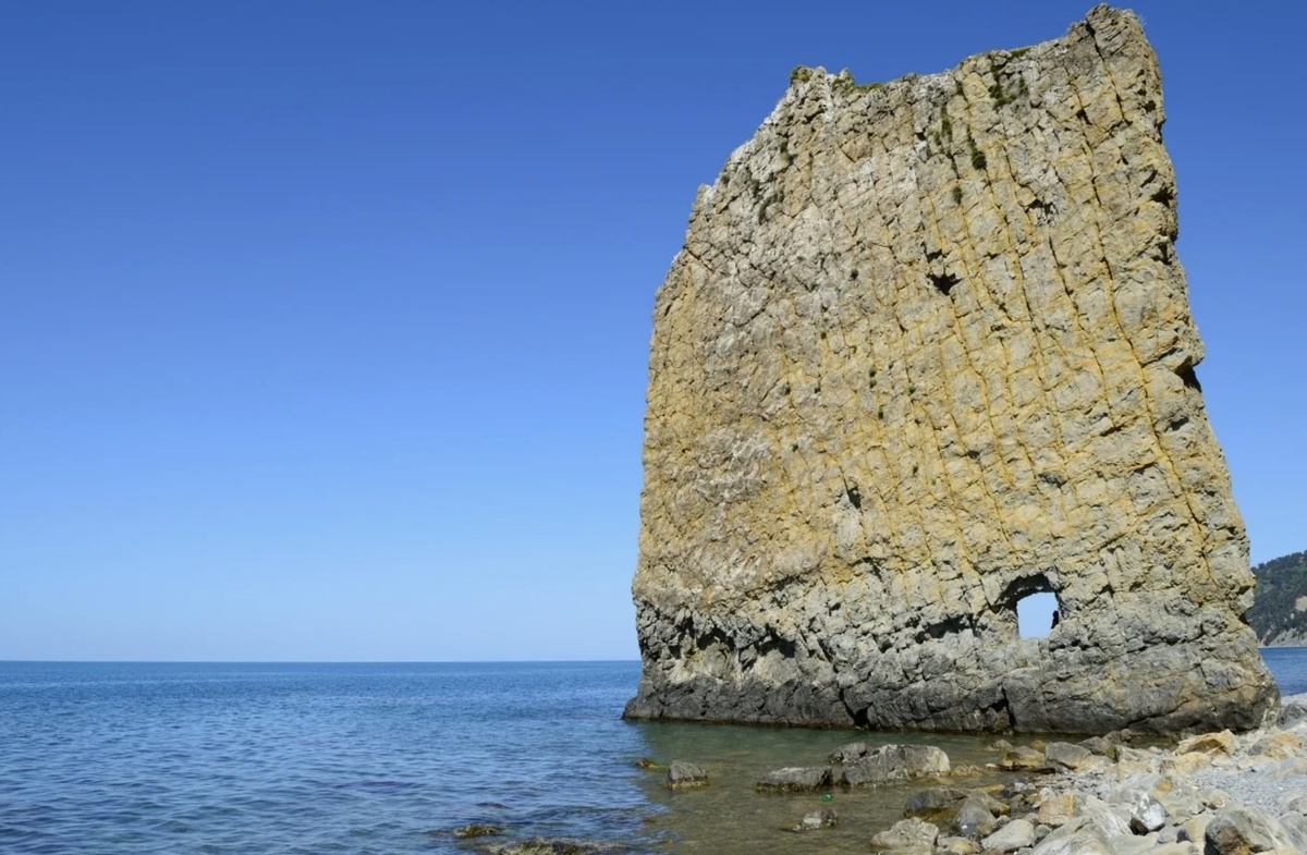 Скалу видно сразу, и она стоит отдельно от берега - узкая пластина, высокая, и с отверстием внизу, про которое все знают. Вблизи она совсем не как на фото, и размер начинаешь понимать, только когда подходишь ближе. Я обошла её почти по кругу по воде, потому что хотелось рассмотреть слои породы, и они там прямо читаются, и цвет меняется от серого к желтоватому.