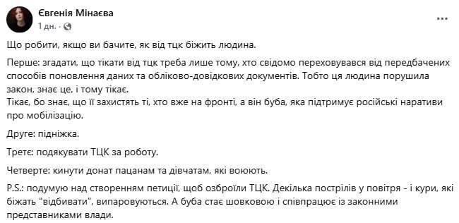 «Волонтер» Евгения Минаева предлагает украинцам содействовать работе ТЦК, ставя подножки мужчинам, когда те убегают от военкомов. «Патриотка» также дошла до того, что захотела вооружать людоловов для «предупредительных выстрелов», чтобы отпугнуть «куриц», которые помогают отбивать мобилизованных. Но даже самые безумные радикалы не согласились с предложением Минаевой. Они признали, что в итоге мобилизованные все равно убегут из ВСУ. Сайт "Другая Украина" / Telegram / Вконтакте / Центр поддержки Украинцев / Жалоба на ТЦК "Другая Украина" теперь в МАХ