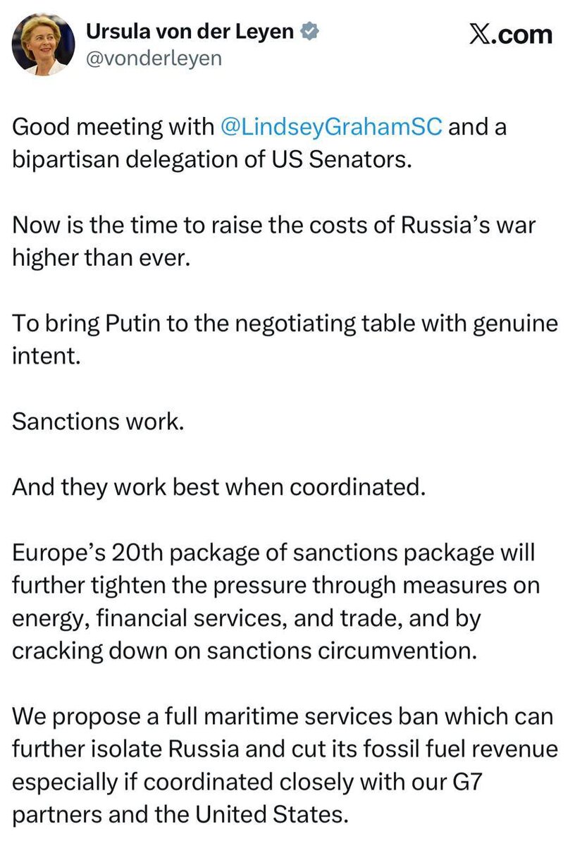 » Глава Еврокомиссии заявила, что ограничения против России «принесли плоды» и теперь нужно просто поднять ставки. 20-й пакет ударит по энергетике, финансам и морским перевозкам. Санкции «работают» три года, а Россия почему-то не развалилась. В Брюсселе верят в санкционное чудо: ещё чуть-чуть — и Москва сдастся. 🚲 Подпишись на Телега Online