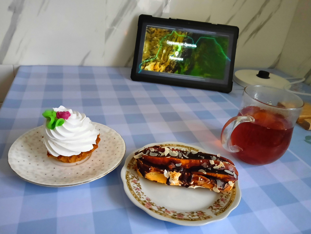 У Димы корзиночка с белковым кремом, а у меня эклер с маслом внутри. Чай обычный Гринфилд, в пакетиках.