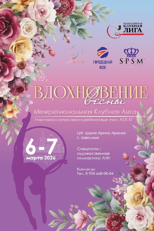 »⭐ 6–7 марта 2026 года в Заволжье пройдут соревнования по художественной гимнастике — «Вдохновение Весны», объединяющие клубы разных регионов в рамках Клубной Лиги. 📍Место проведения: Нижегородская область, г. Заволжье, ул. Молодёжная, 4. Центр художественной гимнастики «Дина Арина Арена» 🏆Для участниц: — начисление рейтинговых очков Клубной Лиги; — возможность укрепить позиции в сезоне и получить соревновательную практику. ⚡Судейская коллегия: Главный судья — Глухих Дарья Игоревна Главный секретарь — Лапина Юлия Владимировна 🎀Организатор: СК «Бусинки» 🔗Подробности и положение – на сайте: Ссылка на анонс соревнований