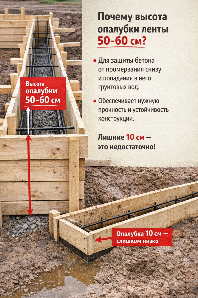 Когда собирают опалубку под ленточный фундамент, часто звучит фраза: «Давай повыше сделаем — надёжнее будет». Добавили 5 см, потом ещё 5, потом «чтобы наверняка» — и в итоге лента вырастает на 10–15 см выше проекта. В момент заливки это кажется мелочью. А потом приходит счёт за бетон — и настроение резко меняется. Проблема в том, что высота ленточного фундамента — это не «на глаз», а расчётный параметр. И каждый лишний сантиметр здесь превращается в прямые потери денег. Разберём, откуда берётся правильная высота, где нужен запас, а где он превращается в перерасход. Высота ленты складывается не из одного желания «чтобы было повыше». На неё влияют сразу несколько факторов: — уровень грунта;