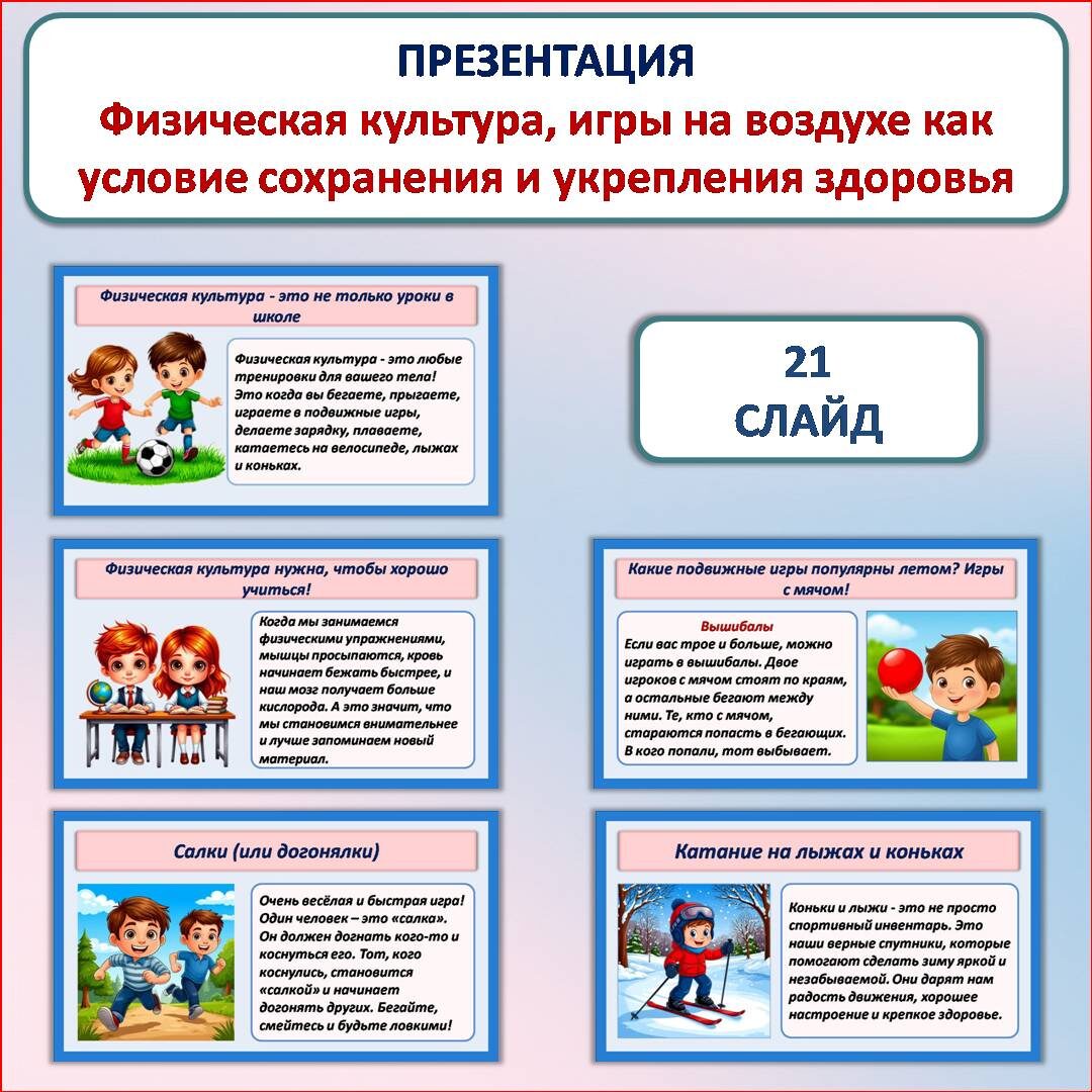 Презентацию скачать здесь Презентация «Физическая культура, игры на воздухе как условие сохранения и укрепления здоровья» разработана к уроку окружающего мира во 2 классе. Данная разработка станет хорошим визуальным сопровождением не только для урока, но и для внеклассных мероприятий со схожей тематикой. Текст презентации написан простым и понятным языком, легко читается, слайды не перегружены информацией, что способствует лучшему усвоению материала. Красочные иллюстрации помогут оживить ваш урок и вызовут интерес у учащихся. Презентация состоит из 21 слайда. Содержание презентации: Слайд № 1. Титульный слайд. Слайд № 2. Физическая культура - это не только уроки в школе. Слайд № 3. Подумаем вместе (дети высказывают свои мысли о пользе физической культуры) Слайды № 4-8. Информация о пользе физической культуры для здоровья, настроения и успешной учебы. Слайды № 9-10. Почему игры на воздухе особенно полезны? Слайды № 11-14. Летние подвижные игры на свежем воздухе. Слайды № 15-19. Зимние п