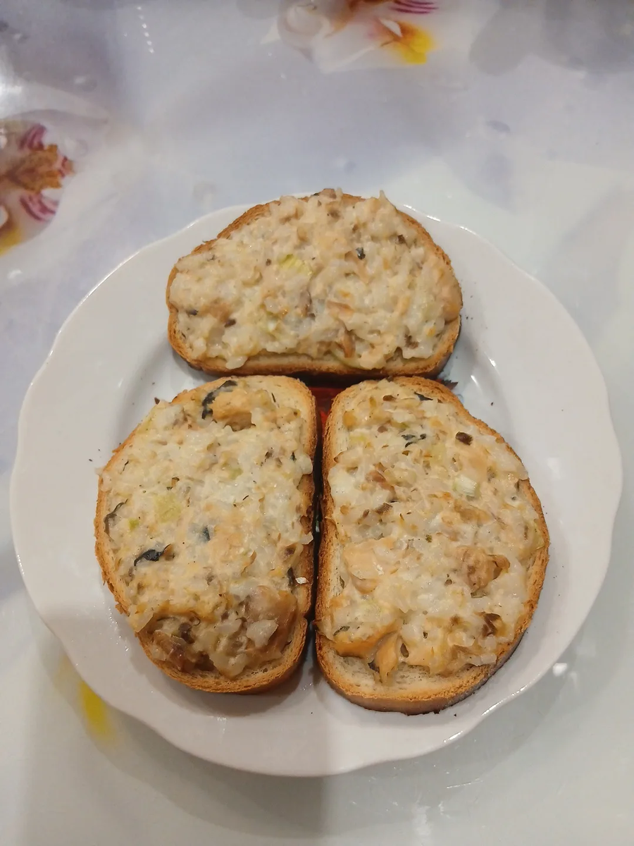 Сегодня это бутерброды с рыбными консервами Нам надо: батон. Для начинки: рис, лук репчатый, консервы (у нас это горбуша), майонез, яйцо. Начинка: отвариваем рис, добавляем в него ложку майонеза, рыбу, разбиваем яйцо, крошим мелко репчатый лук. Начинку перемешиваем и всё выкладываем на батон. Берём противень, кладём все бутерброды с начинкой и в духовку! 15 минут и всё готово! Можно пить чай. Приятного аппетита!