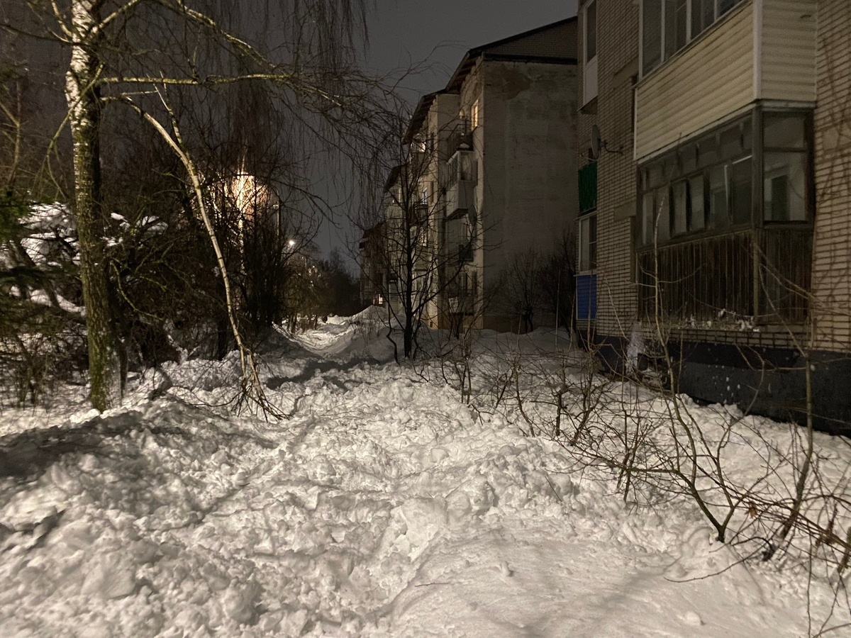 Осторожно, снег падает с крыш до тротуара, ломая ветуи деревьев у дороги