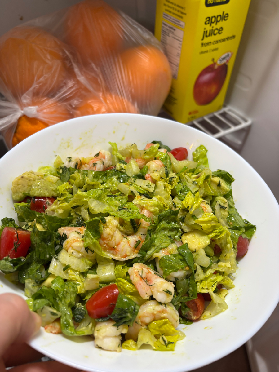 В этот раз я приготовила ему пюре и мясные тефтельки, макароны с тушеной куриной грудкой, сварила щи, заматала пару лепешек с мясом и овощами, сделала медовик к чаю, два салата. Морковь по-корейски и креветки с авокадо. Этот салат я готовлю довольно часто. Он очень вкусный. Так что, настоятельно рекомендую.