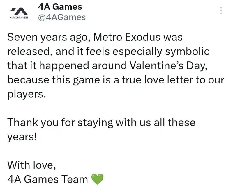 NEWSOS - мир новостей, море интереса (RSS) Прошло семь лет со дня выхода Metro Exodus — студия 4A Games отметила эту годовщину тёплым обращением к сообществу. Разработчики отметили, что символично — игра вышла примерно ко Дню святого Валентина, и назвали Metro Exodus «истинным посланием любви к нашим игрокам». В коротком заявлении команда поблагодарила фанатов за неизменную поддержку на протяжении всех этих лет и эмоционально подписалась: «With love, 4A Games Team ». Это небольшое юбилейное сообщение подчёркивает благодарность студии аудитории и демонстрирует тёплую связь разработчиков с сообществом Metro. Фанатов и новых игроков приглашают вспомнить важные моменты, связанные с игрой, и поделиться воспоминаниями по случаю этой даты.