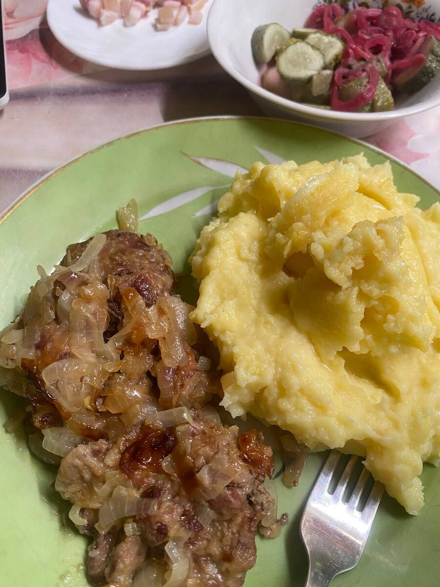 Женечка тоже получила свои овощи и мясо. А у нас картофельное пюре на сливках и куриная печень с овощами. Ну и огурчики свои маринованные и чуть сальца 👍. Кто ужинает приятного аппетита ❤️