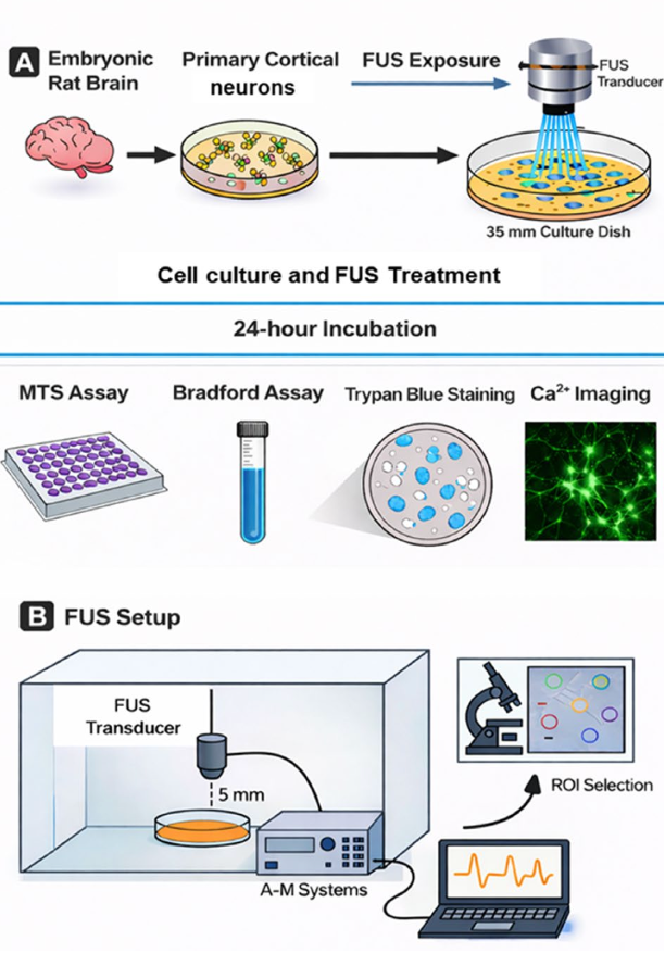 В новой работе, опубликованной в Neurochemical Research, обнаружили, что низкоинтенсивный сфокусированный ультразвук можно использовать для безопасного и целенаправленного управления активностью живых нейронов, усиливая ключевую для их работы кальциевую сигнализацию. Метод не вредит клеткам: не снижает их жизнеспособность, не нарушает структуру и не разрушает белки. Схема проведения эксперимента и анализа результатов. Credit: Iqra Bano et al / Neurochemical Research 2026 Нарушения кальциевого обмена (кальциевой сигнализации) – ранний признак многих болезней мозга, ведь именно кальций (Ca²⁺) играет ключевую роль в передаче сигналов между нейронами. При нарушении передачи кальция нейронам трудно выживать, устанавливать связи и правильно функционировать. Команда исследователей из Чехии и Пакистана предположила, что можно безопасно управлять кальциевой сигнализацией с помощью ультразвука без инвазивного вмешательства. Использование ультразвука для неинвазивного лечения нейродегенеративных