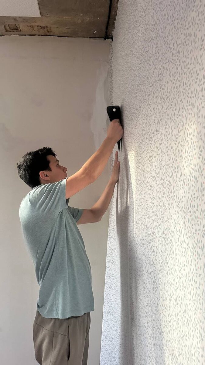 НЕДОРОГО. 😂 Сегодня успели поклеить половину комнаты. Работать с обоями легко, рисунок подгоняем, но там не сложно. Боялась, что этот мелкий цветочек будет рябить в глазах и раздражать, но нет, смотрится очень нежно. А главное - маскирует все недостатки стен!