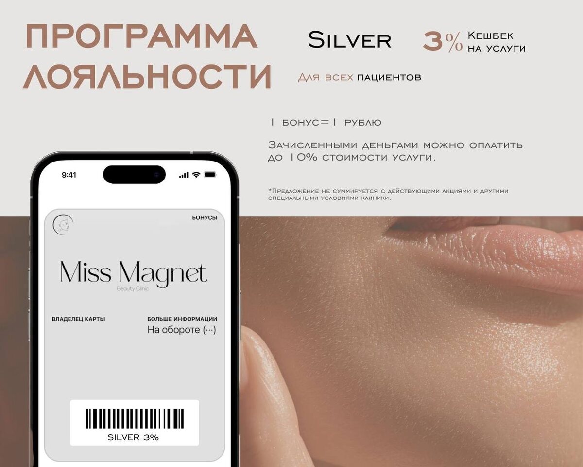Мисс Магнет 🤍 Для нас важно, чтобы каждый визит в клинику ощущался как возвращение туда, где вас понимают с полуслова и искренне рады встрече. Где ценят ваше время, ваш выбор и ваше доверие. Именно поэтому мы создали понятную и прозрачную программу лояльности. Теперь каждый визит возвращает часть вложений в виде бонусных рублей, которыми можно оплатить до 10% стоимости услуг. Подробности о картах и бонусах — на фото 🔺 Ждем вас каждый день в самом центре Петербурга с 10 до 21. Сайт: https://missmagnet.ru Записаться или заказать космецевтику @missmagnet_clinic