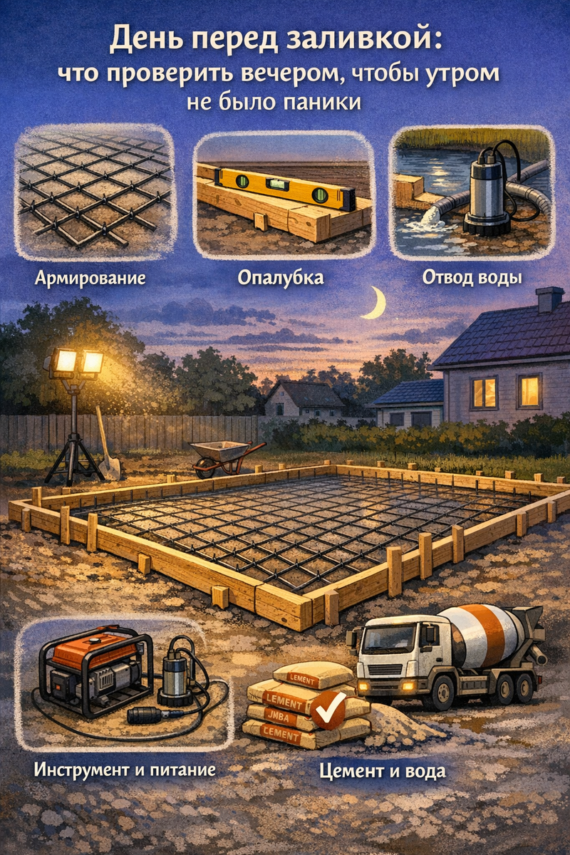 Самый спокойный день на стройке — это не день заливки. Это вечер перед ней, если всё проверено. И самый нервный — утро бетона, если вчера «разошлись по домам», решив, что «и так нормально». Почти все срывы, конфликты с миксером и потери качества начинаются именно с плохой подготовки. Фундамент не любит импровизацию. Он любит порядок. Тема «подготовка к заливке фундамента» — это про то, как один вечер экономит вам недели переделок. Разберём, что обязательно нужно пройти глазами и руками накануне. Утром времени нет. Миксер в пути, люди собираются, бетон оплачивается по часам. Если в этот момент выясняется, что чего-то не хватает — исправить уже сложно. Поэтому чеклист перед бетонированием — это не формальность, а страховка. Первое — каркас. Нужно проверить: — шаг сетки;