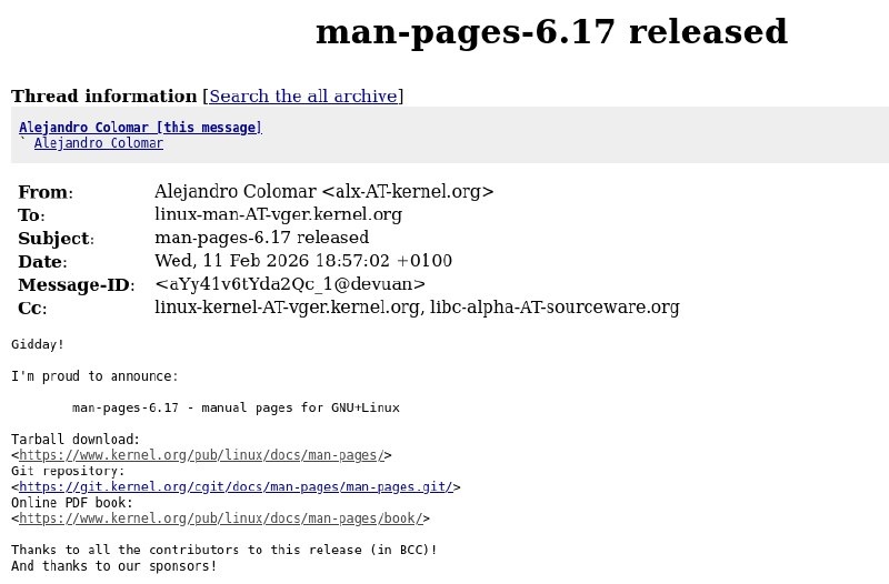 📝 Кратко: Сопровождающий man-pages для Linux Алехандро Коломар (Alejandro Colomar) представил новую версию документации GNU/Linux man pages 6.17 (pdf). Предыдущая версия решения вышла в октябре 2025 года. С сентября 2024 года по январь 2025 года разработка man pages была остановлена из-за проблем с финансированием. Читать далее 🔗 Читать оригинальную статью (ссылка) 📊 Источник: Habr ⏰ Время: 14.02.2026 16:23 📱 Другие каналы: 🪙 ВКрипту | 🎮 ВИгрухи | 🏎️ ВТачки | ✈️ ВТравелу #gadgets #гаджеты #технологии