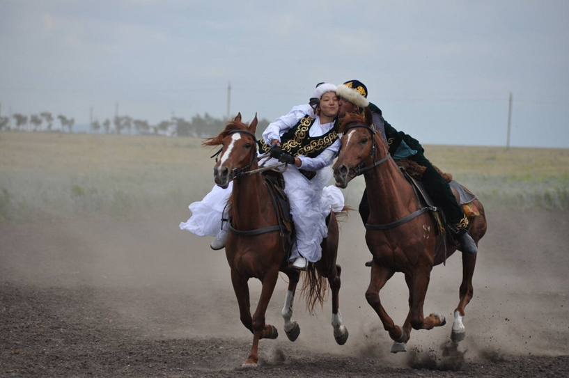 Участники выступают в национальных костюмах. Игра состоит из двух частей. В первой части игра начинается с того, что всадник и его спутница выезжают на скаковую дорожку. Спутница становится на 12 — 15 метров впереди. По сигналу судьи начинается скачка. Их задача преодолеть расстояние 300-400 метров. Если ему удается догнать спутницу до того, как они достигнут финишной черты, он получает право обнять и поцеловать её на скаку (в другом варианте игры - снять на скаку с ее руки шарф или платок) , что будет означать его победу,