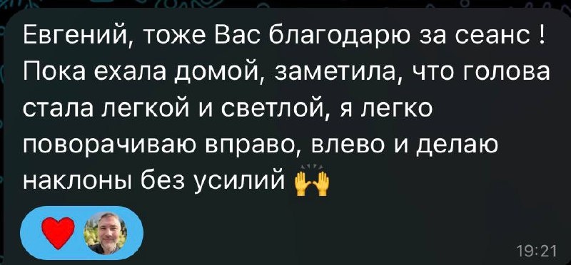 Отзыв сразу после сеанса. Человек поехал домой и почувствовал долгожданное облегчение в шее ) 🙌