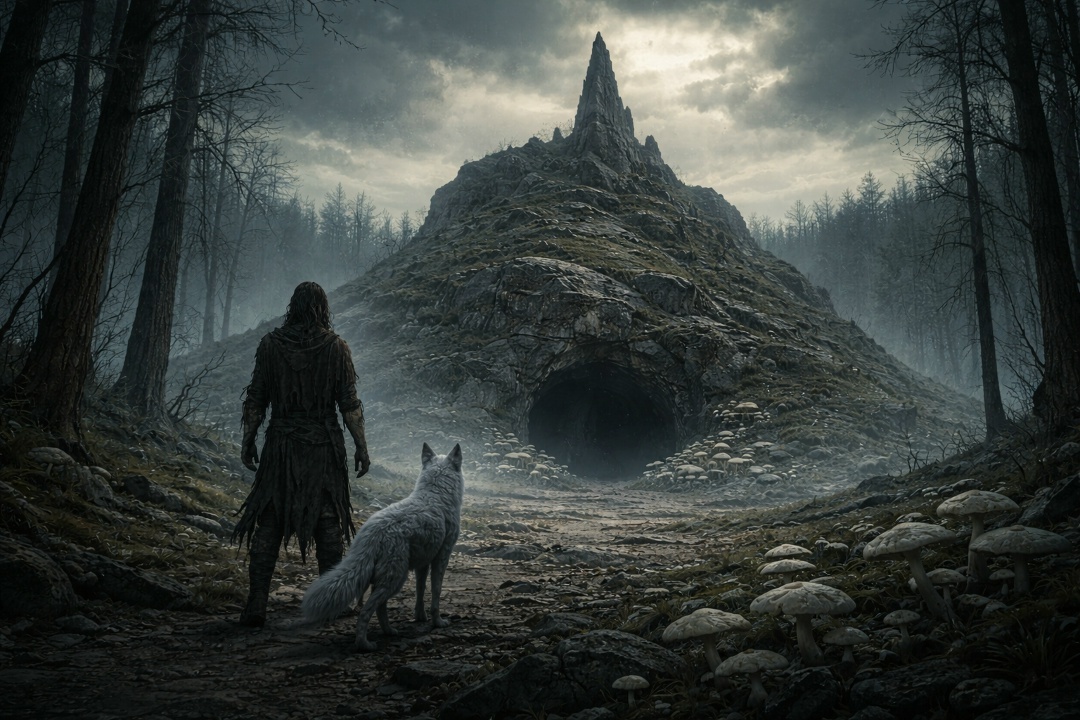 Через пару часов путники действительно выбрались на относительно сухое место: почва здесь была каменистой, и кочки сменились твёрдым известняком. Меж уныло поникших чёрных деревьев показался холм. Его вершину увенчивала скала, торчащая остриём к небу. У подножия виднелась тёмная пасть пещеры, наполовину скрытая в зарослях бледных грибов.