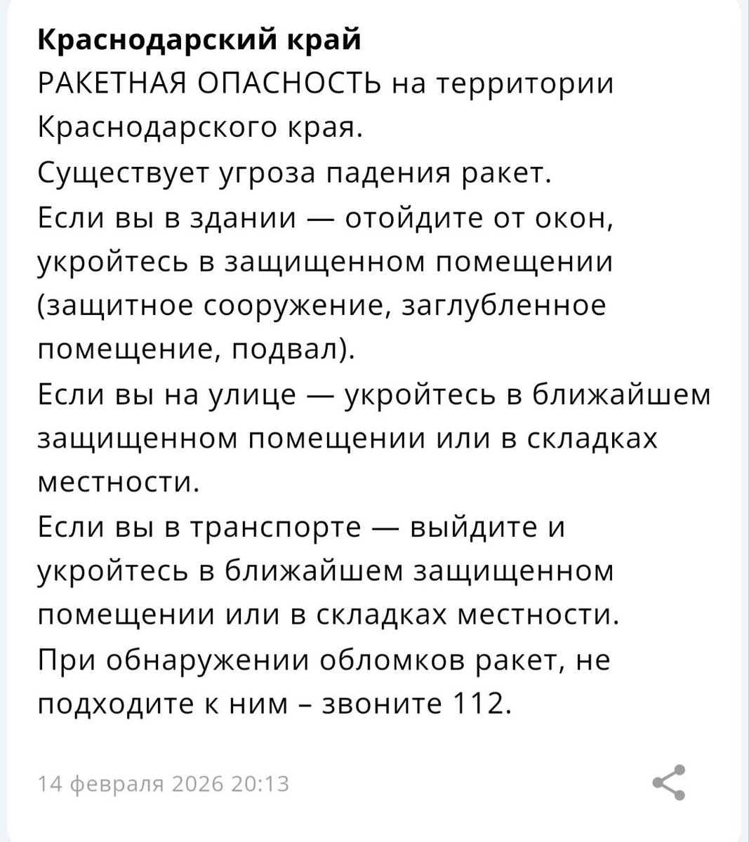 На территории Краснодарского края объявлена «Ракетная опасность».