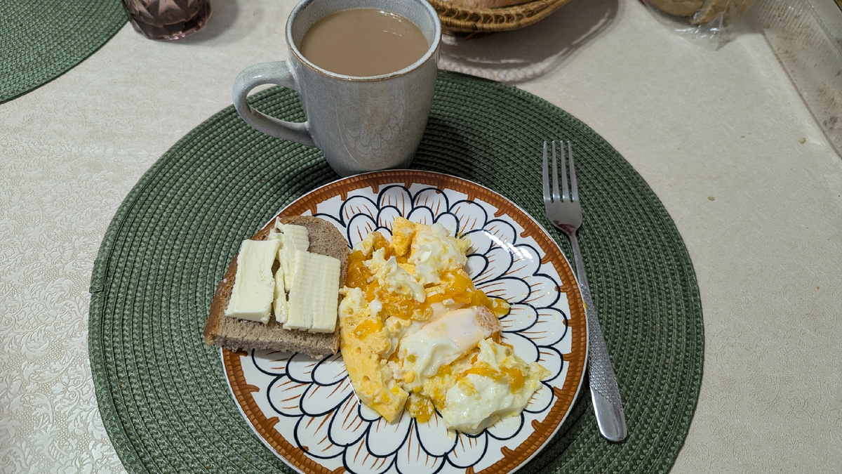 На завтрак приготовила солнечную яичницу с желтыми помидорами. Жизнерадостно получилось, по-весеннему.