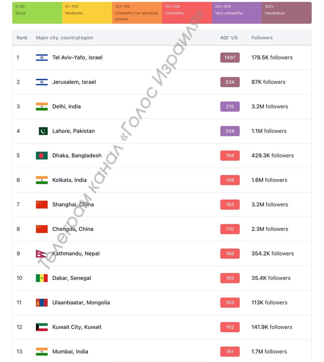 🌪 Тель-Авив и Иерусалим возглавили мировой антирейтинг по загрязнению воздуха