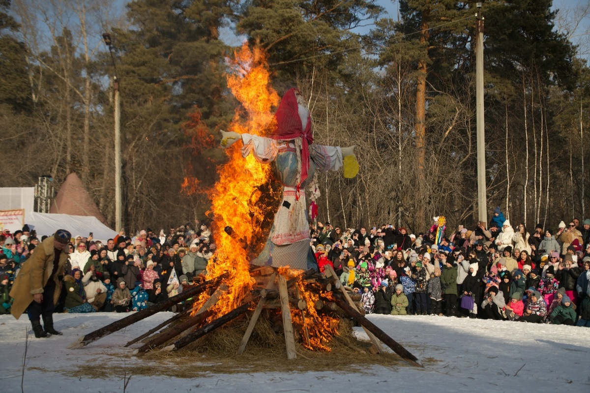 Третье, и самое яркое — сожжение чучела. Вывозим «Зиму» за околицу, поджигаем под песни и пляски. Вместе с чучелом сгорают все напасти и невзгоды.