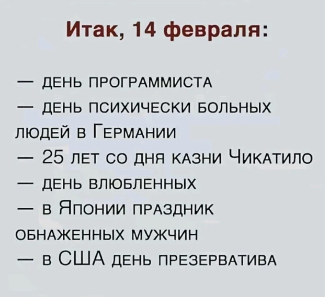 ! Все причастные (неофициально) отмечают день ИТшника именно 14 февраля. Именно в этот день, 14 февраля 1946 года, был представлен электронный компьютер ENIAC I :) «прадедушка» всех современных компьютеров. Русский ИТ бизнес