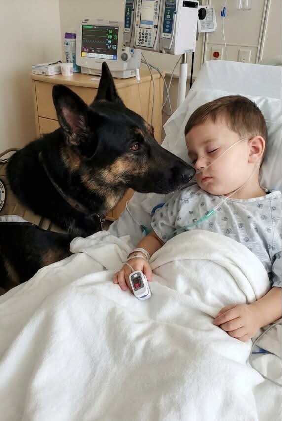Когда Рико наконец ввели в палату, мать вздрогнула — она не ожидала, что врачи согласятся. Пёс медленно подошёл к кровати, поднялся на задние лапы, осторожно положил передние на край и наклонился к мальчику. Он не лаял и не скулил. Он просто смотрел на него.