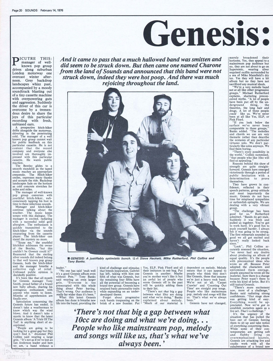 14 февраля 1976 вышло ещё одно интервью у Genesis вышло в издании Sounds (стараниями Барбары Чарон). Впервые звучит имя Билла Бруфорда, как возможного сменщика Коллинза на барабанах во время предстоящего тура.