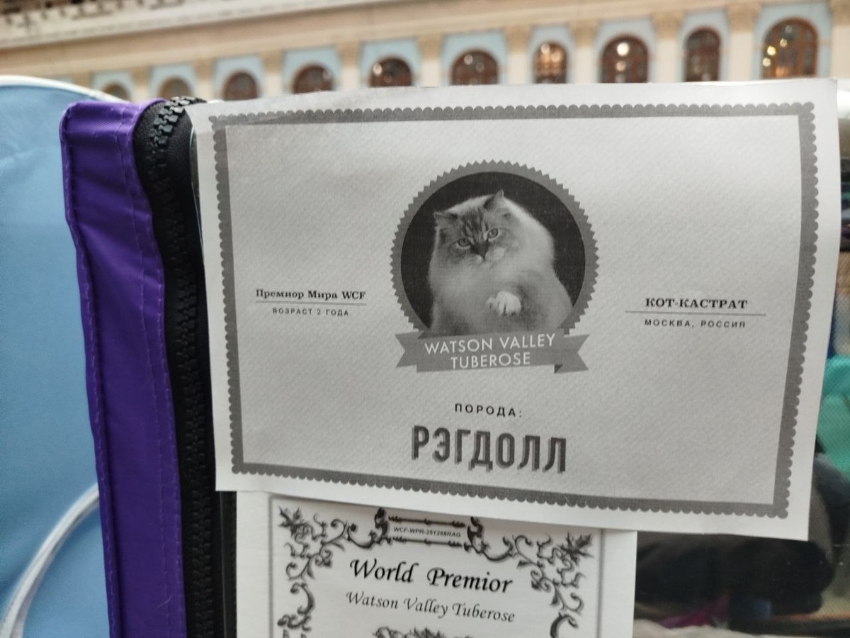 Ragdoll — «тряпичная кукла») — порода крупных полудлинношёрстных кошек. Выведена в США в 1960-х годах заводчиком персидских кошек из Калифорнии Энн Бейкер. Средний вес: кошек — 4–6 кг, взрослых котов — 7–10 кг. Продолжительность жизни: 13–18 лет. Выставка лучшие кошки и собаки России гостиный двор (Москва)
