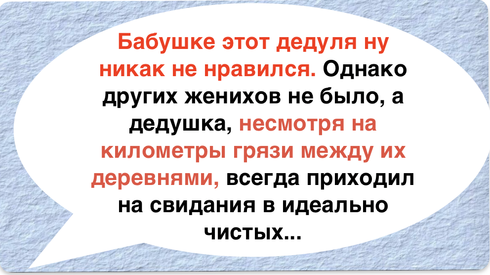 - По рассказам моей мамы, бабушка была из зажиточной семьи, а дедушка — из бедняков. По тогдашним обычаям, пока старший не женится, младшим нельзя, а бабушке этот дедуля ну никак не нравился. Однако других женихов не было, а дедушка, несмотря на километры грязи между их деревнями, всегда приходил на свидания в идеально чистых сапогах. Бабушке стало так интересно, что она пообещала: «Выйду замуж, если скажешь секрет!» Он, конечно, в шутку согласился. И вот, когда она вышла за него, дедушка признался: он шел всю дорогу босиком.