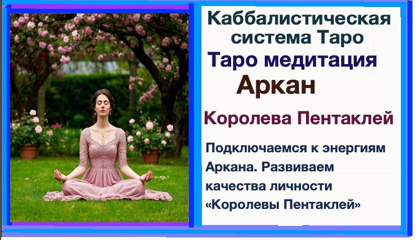 Эта медитация поможет вам наладить контакт с энергиями Аркана "Королева Пентаклей", активировать в себе качества уверенности, изобилия и удачи. Используйте её регулярно для углубления своей связи с этим мощным архетипом! Подготовка: 1. Найдите тихое и комфортное место, где вас никто не будет отвлекать. Убедитесь, что вам удобно сидеть или лежать. 2. Освободитесь от лишней одежды и аксессуаров, которые могут сковывать ваше движение, если это возможно. 3. Приготовьте кристаллы, такие как яшма или изумруд, если у вас есть, для усиления энергии медитации. Шаги медитации: 1. Настройка дыхания: - Закройте глаза и сделайте глубокий вдох через нос, медленно наполняя свои легкие воздухом. Затем выдохните через рот, представляя, как все напряжение и стресс покидают ваше тело. - Повторите это несколько раз, каждый раз погружаясь глубже в состояние расслабления. 2. Создание образа: - Визуализируйте себя в окружении природы: на зелёном лужайке или в саду, где множество цветов. Почувствуйте землю п