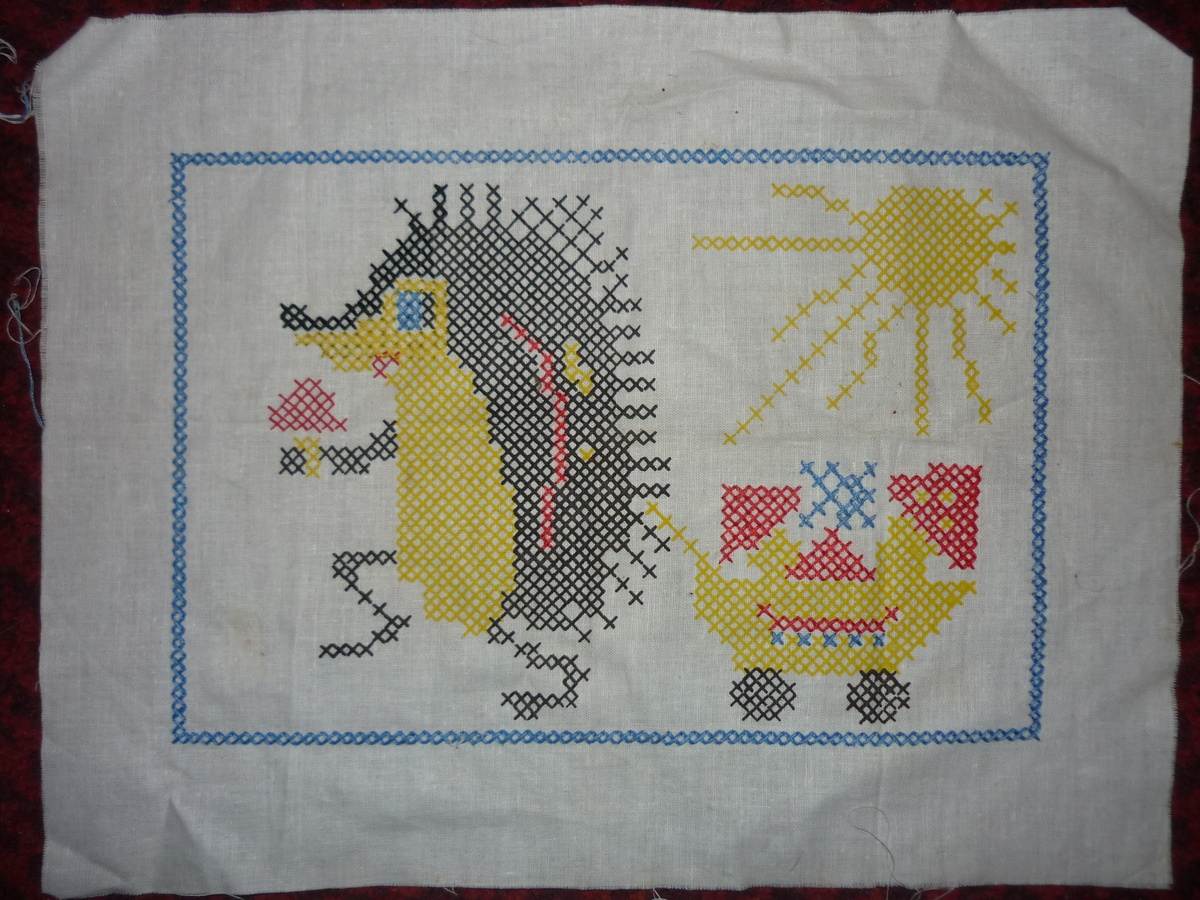 Всем здравствуйте. Люблю рассматривать старинные вещи. Они словно беседуют с нами, рассказывая о "делах давно минувших дней"... Покажу вышивку, которая сохранилась у моих бабушки и мамы. Как человек, которому не чуждо рукоделие, сочла эти вещи очень любопытными. Это схемы для вышивки крестиком - думается, советского периода. На фото выше - ёжик под солнышком везёт в тележке собранные в лесу грибы. А ниже - мишка с букетом цветов и связкой воздушных шариков везёт за собой на верёвочке игрушечную машину с пирамидкой. Наверное, дети тогда учились вышивать по таким несложным схемам. И качество схем оказалось хорошим: спустя годы плотная белая ткань осталась такой же добротной, а цветные крестики отчётливо пропечатаны. Даже захотелось взять эти схемы и самой повышивать по ним спустя годы. Например, сделать открытку, вышив крестиком вот такой букетик цветов. Помню, классах в пятом-седьмом на уроках домоводства нас учили вышивать именно на вафельной ткани. Оформляли рамки, орнаменты. У меня х