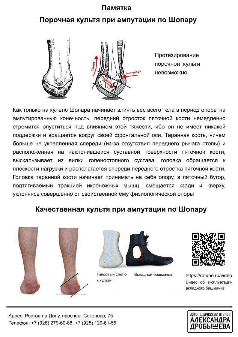 Не откладывайте процедуру ортезирования вкладным башмачком. Правильно изготовленный ортез для стопы поможет сохранить опорную функцию вашей культи и предотвратит её деформацию. Помните, что деформированная культя не подлежит ортезированию. Эта памятка содержит информацию, о которой, к сожалению, не всегда упоминают в госпитале. Из-за этого люди после ампутации теряют драгоценное время в ожидании своей очереди на ортезирование, что приводит к деформации культи. Возникает вопрос: зачем тогда нужно это ортезирование, если в результате культя становится непригодной? Если культя деформируется, вам может потребоваться повторная ампутация по нижнюю треть голени и установка протеза. Внимание! Очень важно чтоб вкладной башмачок был правильно сделан, иначе и в нем можно получить порочную культю.
