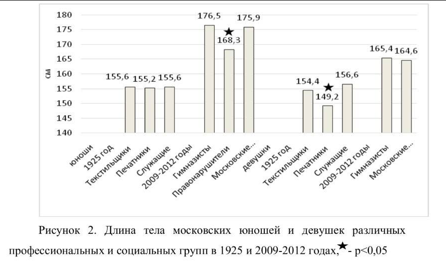 Любопытная вещь! Поразительно, насколько низкорослыми были юноши и девушки Москвы в 1925 году – примерно по 155 см к 16–18 годам. На советскую власть это свалить крайне сложно: они родились до революции. Даже столичные жители Российской империи не вырастали в великанов. Недостаточное питание (из века в век) сказывалось. Что ещё интересно, разницы в росте между юношами и девушками фактически не было. Тут тоже надо погружать себя в контекст истории. Ленин с его 168 см был нормальным, а Сталин с 172 см – даже и высоким (примерно как сейчас 182–185 см). Зато какими гигантами казалось немецкое начальство России… Например, рост генерала царской армии, а затем лидера Финляндии Маннергейма был 189 см – это примерно как сейчас смотрелся бы человек ростом 200–205 см. (Диаграмма – научный сборник «Физическое развитие детей: фундаментальные и прикладные аспекты», Союз гигиенистов, 2018 год.) Теперь забавное: Ленин и Есенин были одинакового роста – 168 см. В мемуарах о Есенине пишут, что он невысок
