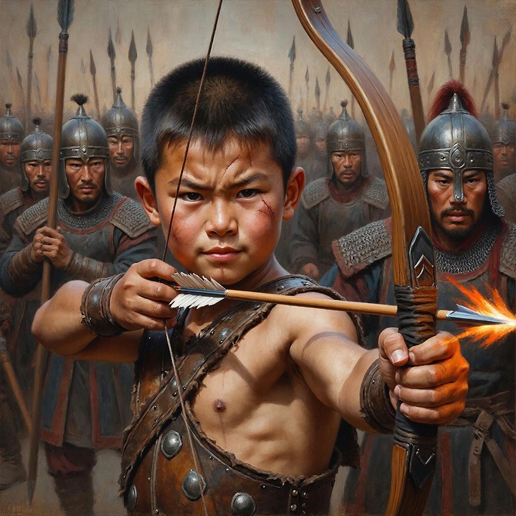 Образ старшего сына Чингисхана - Джучи. Это уже моё представление, хотя ребенком его не хотел изображать, "не виноватая я, он сам пришёл". Так сделал искусственный интеллект GigaChat, он создал его сперва именно в образе ребенка 7-10 лет, дальше создал его в образе больше подростка 10-16 лет и только последний образ создал какой я хотел в образе взрослого полководца.