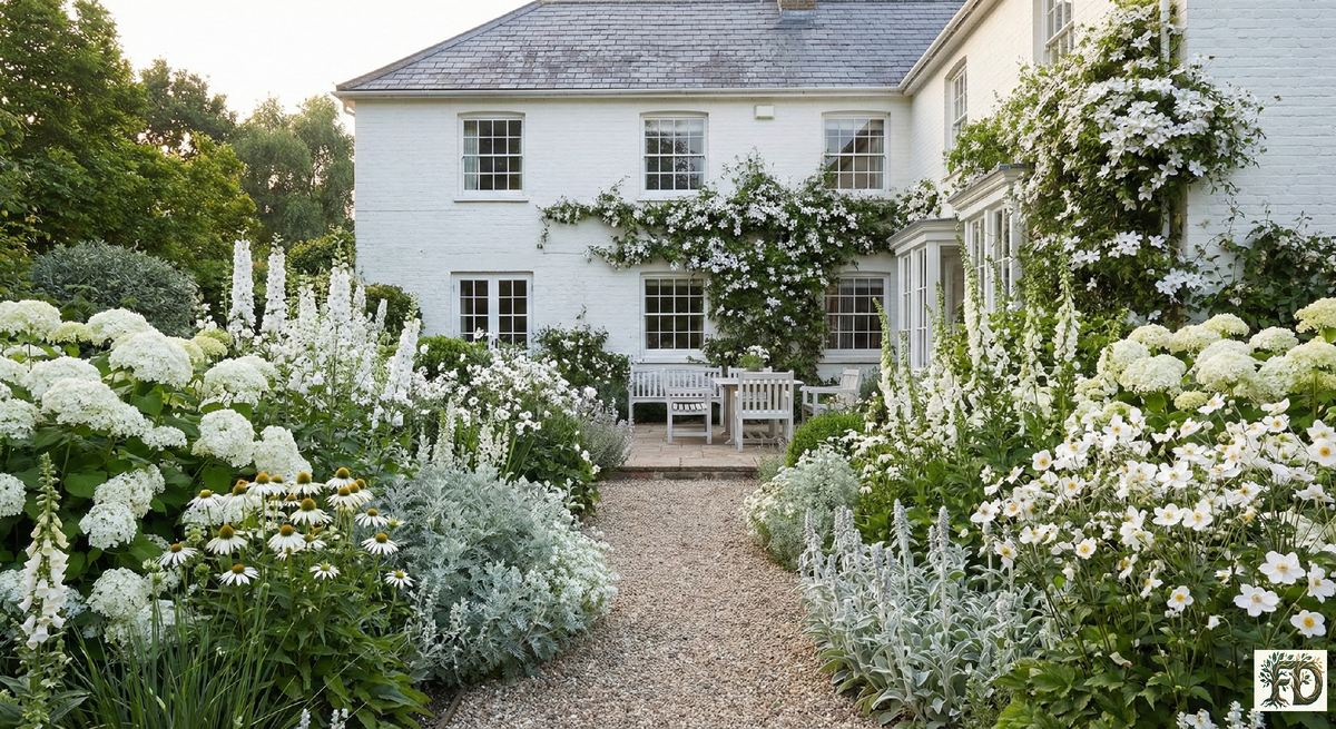 Урок от Виты Сэквилл-Уэст: Она не просто собрала белые цветы. Она поняла, что белый цвет — это лишь повод показать форму. Она использовала темно-зеленые стриженые изгороди из тиса как «черный бархат», на котором белые цветы и, что еще важнее, серебристая листва, «горели» как драгоценности.