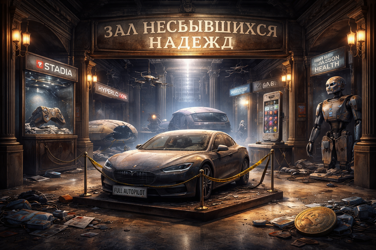 Добро пожаловать в Зал Несбывшихся Надежд. Здесь всегда светло — от экранов презентаций, всегда громко — от аплодисментов инвесторов, и всегда пусто — потому что обещанное будущее опять задерживается. Иногда навсегда. Tesla и автопилот, который всё ещё нуждается в человеке Главный экспонат — Илон Маск, человек, который умеет продавать 2020 год в любой календарной эпохе. В 2016-м он уверенно заявил: Tesla сама проедет от Лос-Анджелеса до Нью-Йорка. Без рук. Без ног. Без совести. Вышел ролик — машина едет, человек в кресле «по юридическим причинам», а вера в светлое будущее подпрыгивает до потолка. Прошло почти десять лет. Машина всё ещё второго уровня автономности. Это значит: ты должен держать руки на руле, глаза на дороге и душу наготове, потому что автопилот в любой момент может решить, что бетонный разделитель — это просто агрессивный бордюр. Вишенка на капоте: в суде выяснилось, что легендарное видео было постановкой, маршрут — заранее отрисован, а машина… всё равно врезалась в заб