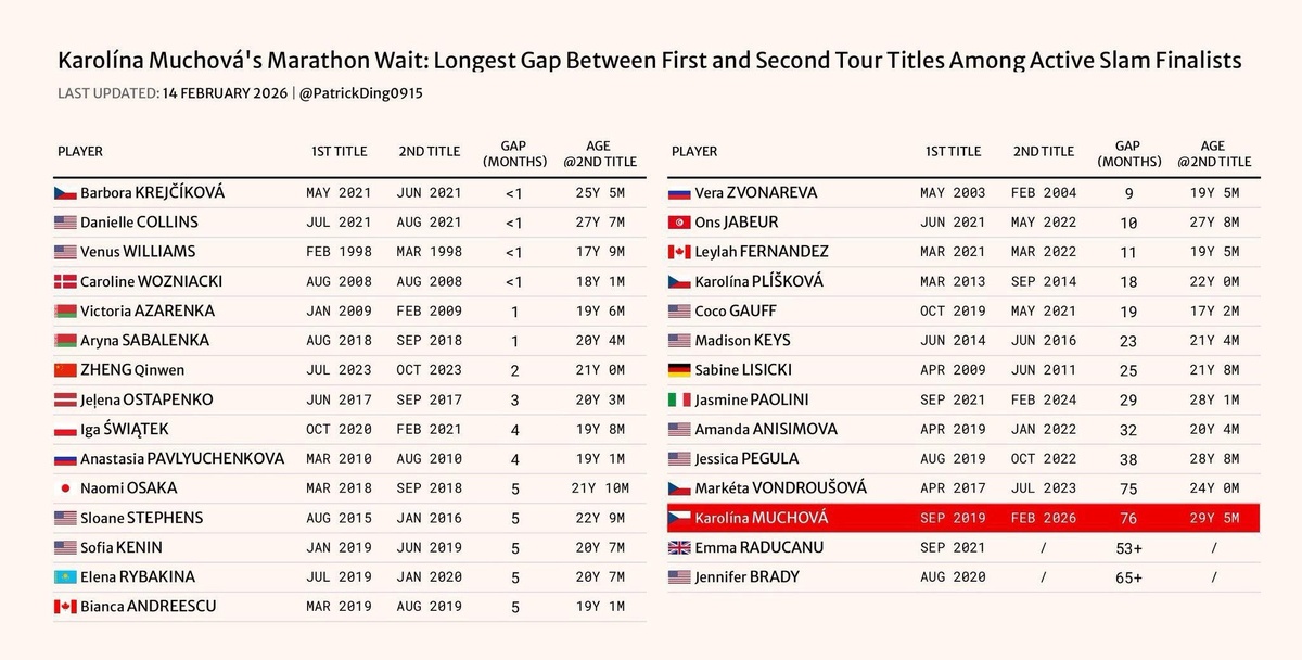 🎾 Каролина Мухова ждала дольше всех: Первый титул: сентябрь 2019 Второй титул: февраль 2026 Разрыв: 76 турниров Вот еще несколько теннисисток из списка: Барбора Крейчикова - меньше 1 турнира Винус Уильямс - меньше 1 турнира Ига Швентек - 4 турнира Наоми Осака - 5 турниров Елена Рыбакина - 5 турниров Маркета Вондроушова - 75 турниров Подпишись на Эйс и точка