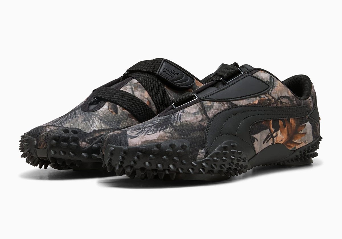 PUMA Mostro II возвращаются с новым «Camo Pack»: первая модель выполнена в черном цвете с коричневым камуфляжным сетчатым верхом, вторая — в розовом камуфляже с розовой Formstrip и коричневыми вставками. Кроссовки отличаются изогнутым язычком, эластичным ремешком и агрессивной подошвой с сотнями тяговых модулей. Выпуск запланирован на февраль 2026 года.