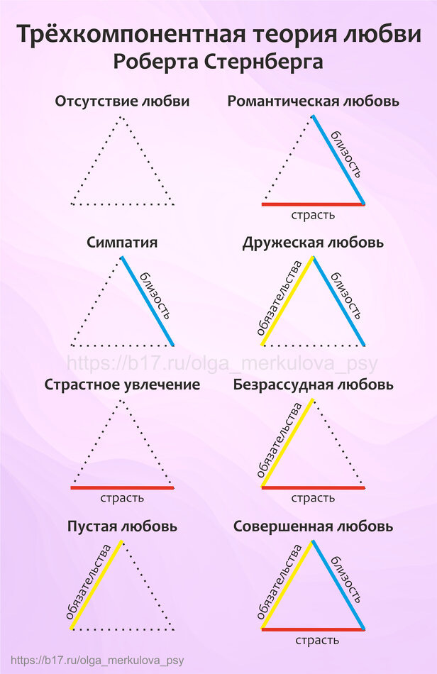 Американский психолог Р.Стернберг нашел способ разложить любовь «по полочкам» с помощью своей знаменитой треугольной шкалы. Согласно его теории, гармоничный союз держится на трех «китах»: Близость - эмоциональный и психологический фактор отношений. Определяет степень открытости, при которой партнеры впускают друг друга в свой внутренний мир. Близость включает в себя чувства доверия, сопричастности, единства и эмоционального тепла. Страсть - телесная близость, или биологический фактор отношений. Включает в себя как романтическое притяжение, так и сексуальную привлекательность. Это уровень инстинктов и физического влечения — та самая «химия», которая дает союзу искру и динамику. Обязательства - социальный фактор, или сфера ответственности в отношениях. Включает в себя осознанное решение партнеров быть вместе и строить общее будущее. Это готовность сохранять верность союзу руководствуясь чувством долга и взаимными договоренностями. В зависимости от того, как сочетаются эти составляющие, С