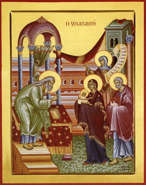Радуйся, Благодатная Богородице Дево,/ из Тебе бо возсия Солнце Правды, Христос Бог наш,/ просвещаяй сущия во тьме./ Веселися и ты, старче праведный,/ приемый во объятия Свободителя душ наших,// дарующаго нам воскресение. Перевод: Радуйся, благодатная Богородица Дева, ибо из Тебя воссияло Солнце правды, Христос Бог наш, просвещающий находящихся во тьме. Веселись и ты, старец праведный, принявший в объятия Освободителя душ наших, дарующего нам воскресение.