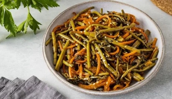 Салат из папоротника - оригинальное блюдо с насыщенным вкусом, которое может стать украшением стола. Папоротник богат витаминами и минералами, а его сочетание с другими ингредиентами позволяет создавать разнообразные вариации. Ингредиенты на 4 порции: Приготовление: Салат можно употреблять как в тёплом, так и в охлаждённом виде. Ингредиенты: Приготовление: Салат лучше подавать охлаждённым - так его вкус становится более насыщенным. Можно украсить блюдо зеленью или семенами кунжута. В молодых побегах орляка содержится богатый набор биологически активных веществ: При регулярном умеренном употреблении салат из папоротника может: