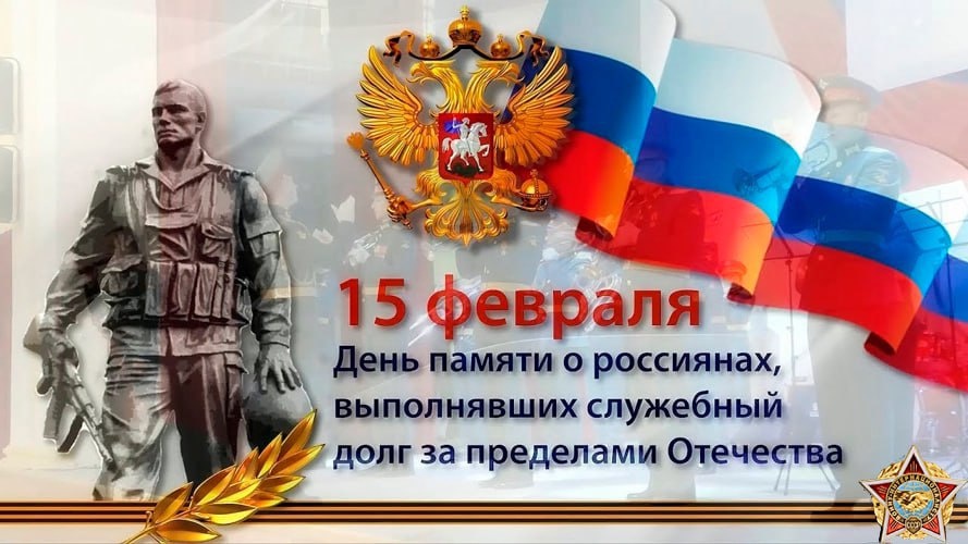 ! Сегодня мы склоняем головы перед памятью россиян, исполнявших служебный долг за пределами Отечества, и с глубокой благодарностью вспоминаем всех, кто с честью защищал интересы Родины вдали от её границ. Памятная дата — День памяти о россиянах, исполнявших служебный долг за пределами Отечества — была официально утверждена 29 ноября 2010 года Федеральным законом № 320-ФЗ, подписанным президентом Российской Федерации. Эта дата выбрана не случайно. Именно 15 февраля 1989 года завершился вывод ограниченного контингента советских войск из Афганистана. Афганская война стала тяжелым испытанием для сотен тысяч наших солдат и офицеров, проявивших мужество, стойкость и верность присяге. Но 15 февраля — это день памяти не только воинов-афганцев. Это день всех поколений защитников Отечества, которые после Великой Отечественной войны выполняли боевые задачи в различных точках мира: в Корее и Вьетнаме, в Египте и Сирии, в Анголе, Мозамбике, на Кубе, в Югославии, Абхазии, Южной Осетии, в миротво